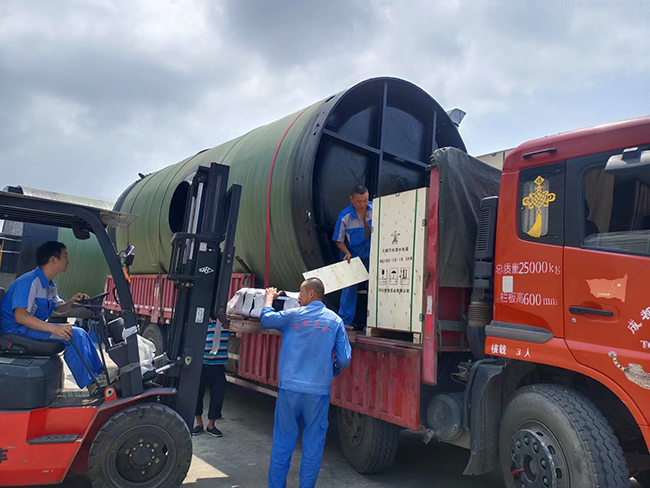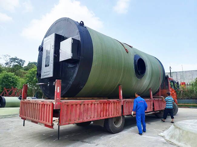 我司用户定制玻璃钢一体化预制泵站生产完成装车发货现场,应用盐亭污水收集提升项目!