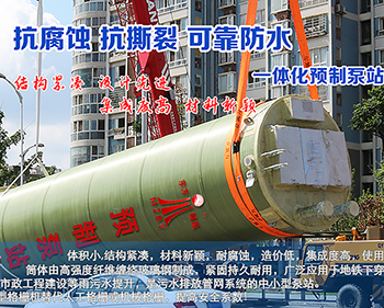 预制泵站是我公司吸收国内外**技术的基础上研发而成的集成式预制泵站。该泵站的筒体采用强化玻璃钢自动化缠绕浇铸而成。内部的水泵、管路、阀门、仪表、控制设备、楼梯以及其它用户所需要的附件均由本公司成套提供,并安装完毕后出厂。泵井内自带维修平台及格栅粉碎机,是一种使用方便,质量可靠,土建工作量小,成本较低的新型一体化泵站设备,容积优化是其显著的特征,可以作为中小型混凝土泵站的**品。